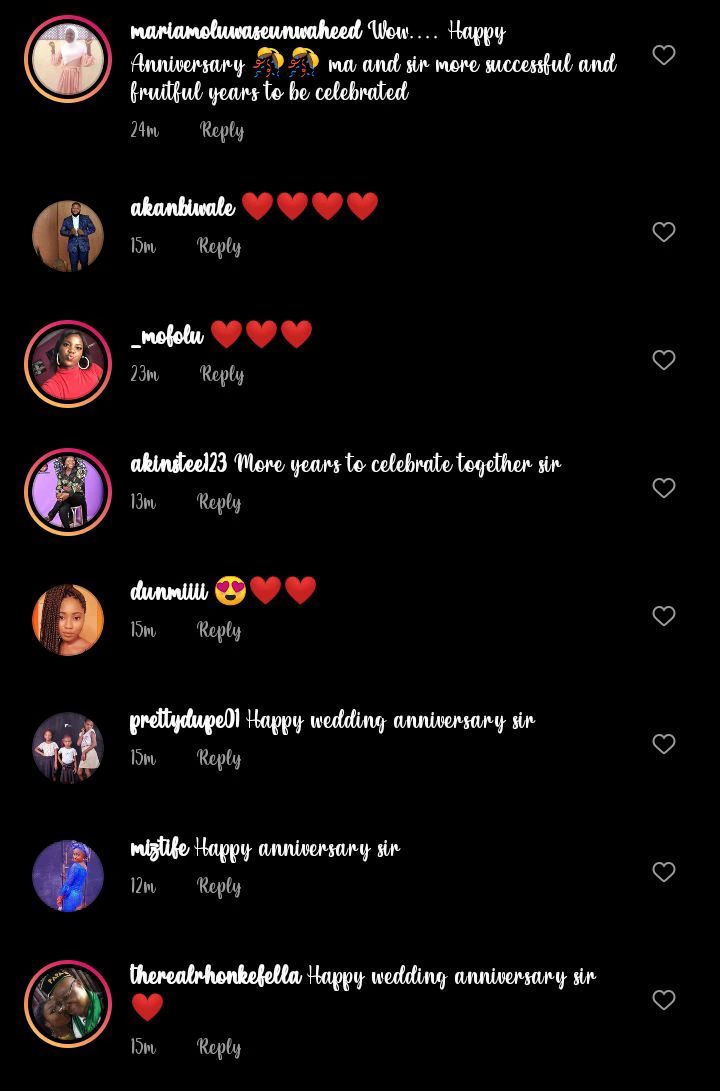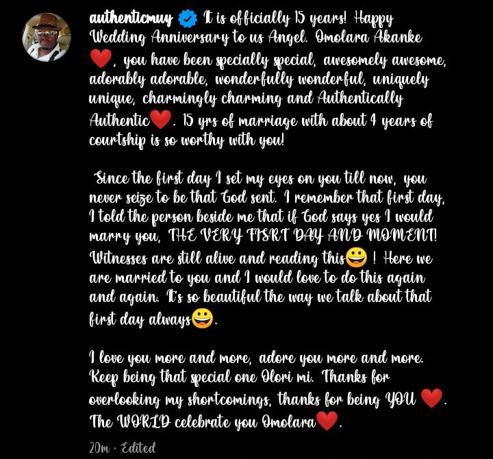 The 50-year-old wrote, “It’s officially 15 years! Happy Wedding Anniversary to us Angel, Omolara Akanke, you have been specially special day, adorably adorable, wonderfully wonderful, uniquely unique, charmingly charming and Authentically Authentic. 15 years of marriage with about 4 years of courtship is so worthy with you!”