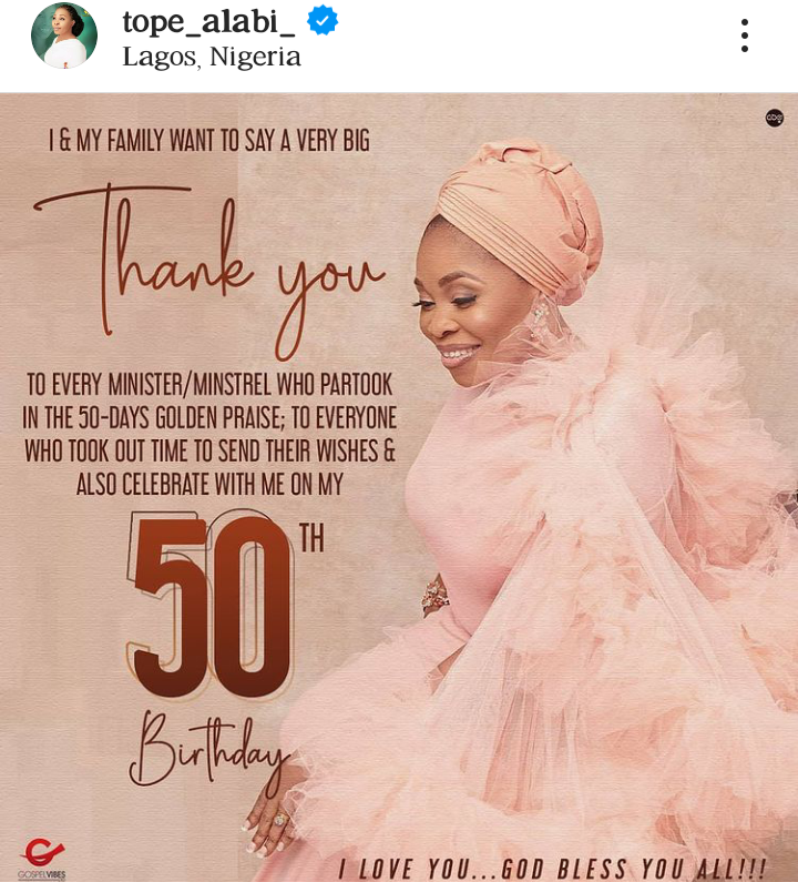 Tope Alabi popularly known as ‘Ore ti o common’ is a popular Nigerian gospel singer, film music composer, and actress. She was born on the 27th of October 1970 in Lagos State to a Christian family. She is the only daughter out of three children of Pa Joseph Aknyele Obayomi and Madam Agnes Kehinde Obayomi. Tope Alabi will clock 51 in the next two months, but she looks younger than her age.