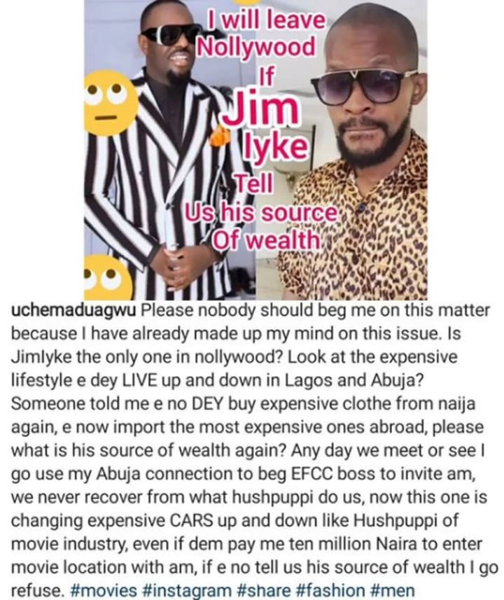 From what we knew at the time the news broke, Uche Maduagwu had accused Jim Iyke of being a ritualist saying that “if even if dem pay me ten million naira to enter movie location with am, if e no tell us his source of wealth I go refuse.”