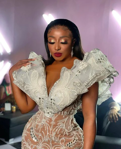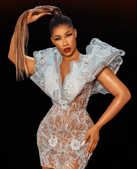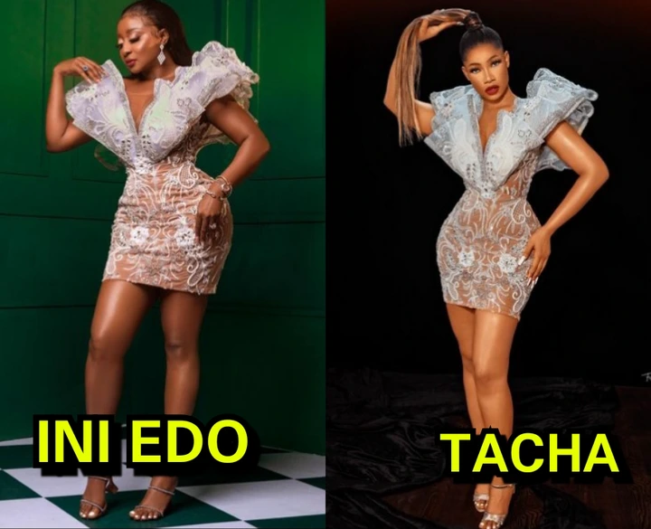 Another pairs of Nigerian celebrities who have thrilled fans online with their fashion sense wearing the same outfit is the veteran Nollywood actress, Ini Edo and the popular reality TV star, Tacha. Ini Edo and Tacha wowed fans as they both stuns in a design short gown of a mix colour of white and gold and both matched it with a golden heel shoes.
