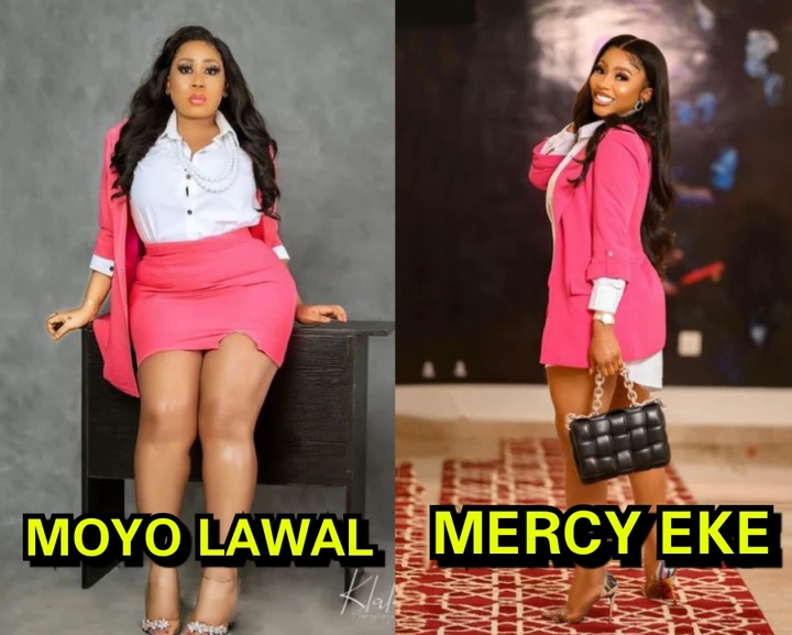 The last pairs of the Nigerian entertaners who have worn same outfit in our research is the popular film maker, Moyolawal and the former Big Brother Naija housemate, Mercy Eke as they both dressed like a secretary in white and pink. Moyo Lawal matched her own with short skirt while Mercy stuns in her own ways of fashion. Check out their photographs below: